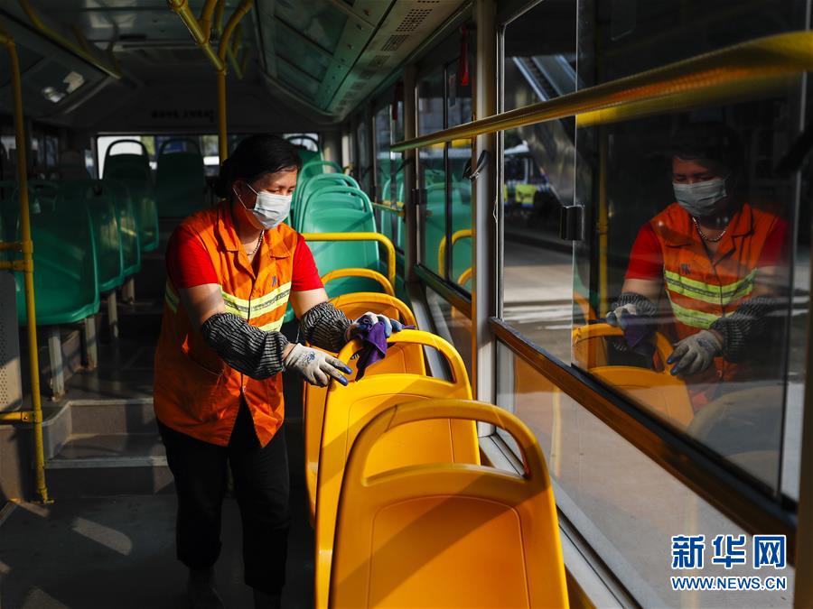 3月23日,武漢公交集團(tuán)站務(wù)公司保潔員趙真香在清潔518路公交車。新華社記者沈伯韓攝