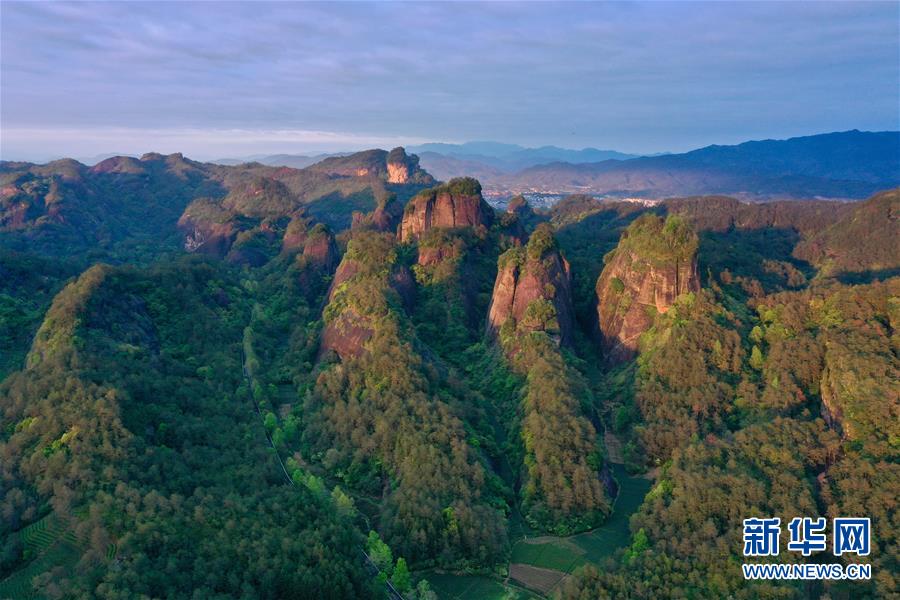 這是夕陽照射下的武夷山國家公園丹霞群巒(4月1日攝,無人機照片)。 新華社記者 姜克紅 攝