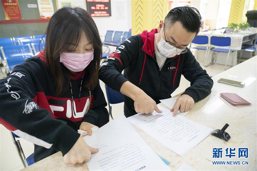 4月7日,在武漢市江岸區(qū)民政局婚姻登記處,新人陳先生與張女士辦理結(jié)婚登記手續(xù)。 新華社記者才揚攝