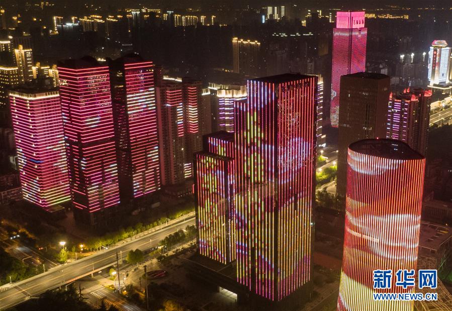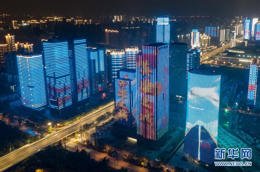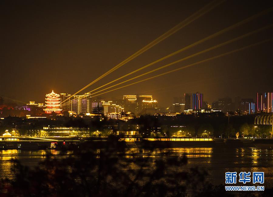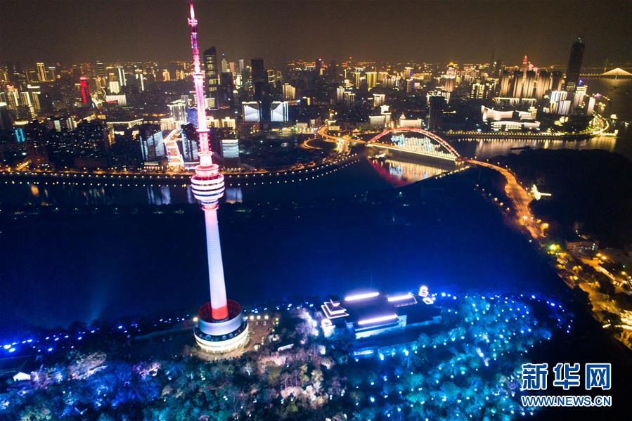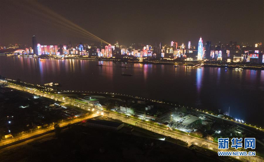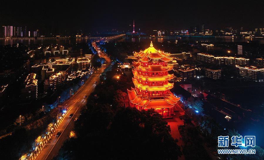 4月8日零時起,武漢市正式解除離漢離鄂通道管控措施,全市景觀照明開啟(無人機拍攝)。新華社記者程敏攝