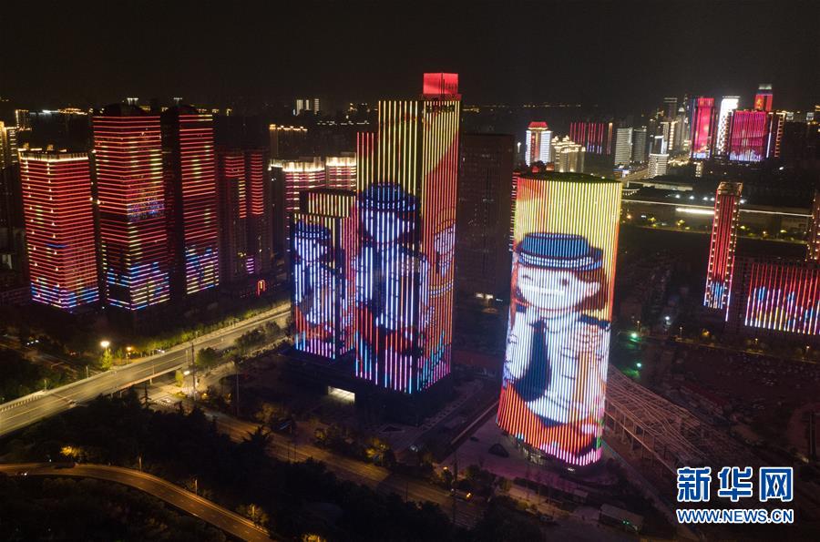 4月7日,武漢光谷環(huán)島開啟燈光秀(無人機照片)。當日,隨著武漢解除離漢通道管控進入倒計時,全市開啟了城市景觀照明,夜色中的武漢美不勝收。新華社記者李賀攝