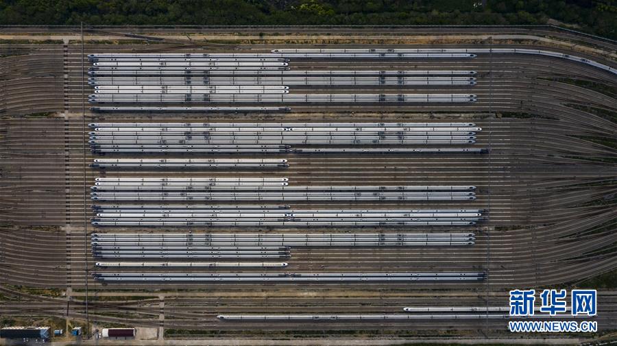 4月7日,在武漢動車段,列車??吭诖孳嚲€上(無人機(jī)照片)。新華社記者 沈伯韓 攝