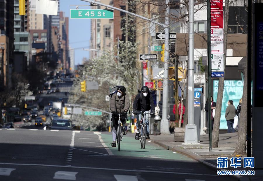 3月21日,在美國(guó)紐約第二大道,人們戴口罩騎車出行。新華社記者王迎攝
