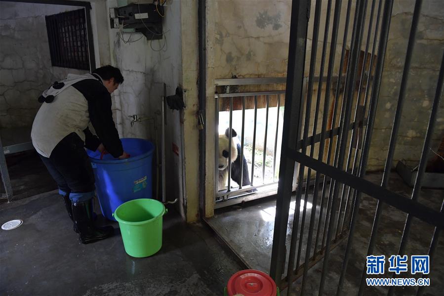 4月14日,中國大熊貓保護研究中心核桃坪基地飼養(yǎng)員周季秋在大熊貓“喜妹”的圈舍內(nèi)打掃衛(wèi)生。新華社記者張超群攝