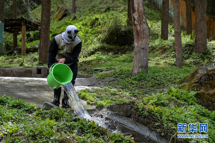 4月14日,中國大熊貓保護研究中心核桃坪基地的飼養(yǎng)員周季秋身著涂抹了稀釋后大熊貓尿液的“熊貓偽裝服”,在大熊貓活動場內(nèi)打掃衛(wèi)生。新華社記者張超群攝