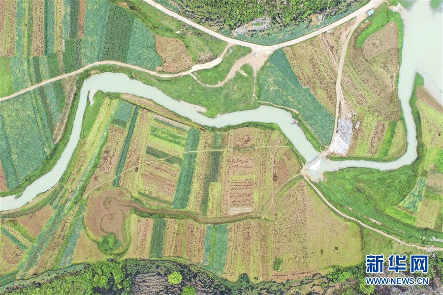 4月23日,在廣西隆安縣南圩鎮(zhèn),農(nóng)人趕著牲畜走過(guò)一座小橋(無(wú)人機(jī)照片)。新華社記者周華攝