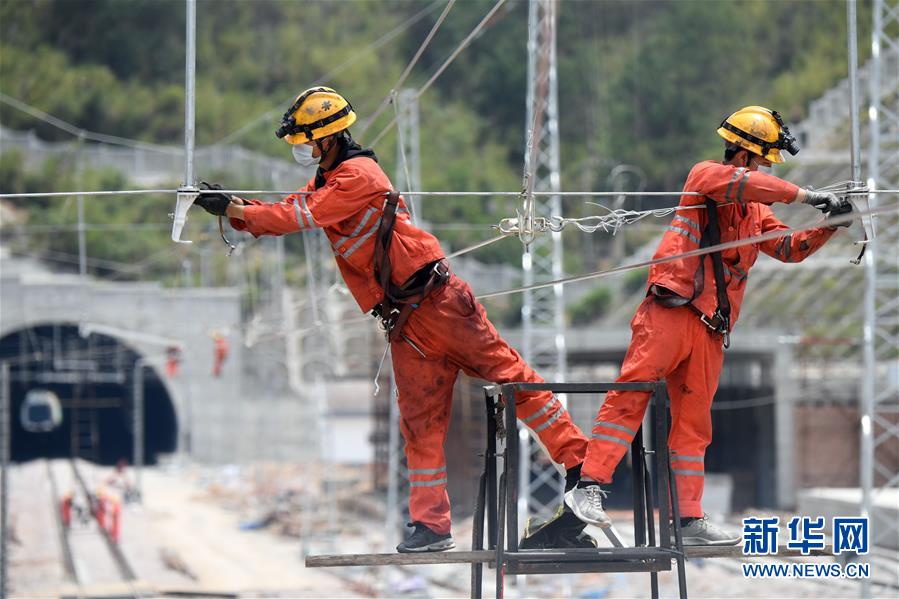 4月25日,在福建省寧德市屏南車站,施工人員開(kāi)展接觸網(wǎng)調(diào)整作業(yè)。中鐵電氣化局集團(tuán)上海公司推動(dòng)衢寧鐵路福建段通信工程、信號(hào)工程、電力工程、電氣化工程各環(huán)節(jié)協(xié)同復(fù)工復(fù)產(chǎn),目前來(lái)自河北、河南、四川等國(guó)內(nèi)10個(gè)省的900多名員工返崗就業(yè)。衢寧鐵路北起浙江省衢州市,南至福建省寧德市,全長(zhǎng)379.2公里。新華社記者彭張青攝