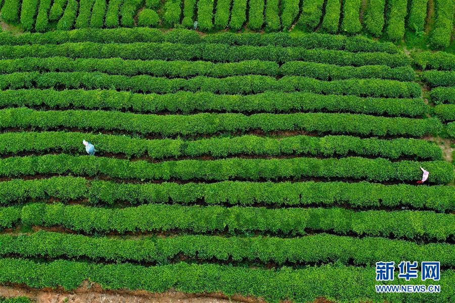 4月25日,茶農在“扶貧茶園”內采茶(無人機照片)。谷雨過后,在貴州省黔東南苗族侗族自治州丹寨縣“扶貧茶園”,茶農搶抓農時趕制春茶。丹寨縣創(chuàng)新產業(yè)扶貧模式,鼓勵社會公眾線上認領茶園,再由茶園聘請當?shù)刎毨魟展?,為貧困戶?chuàng)造茶園管理、采茶、制茶等就業(yè)機會,幫助貧困戶增收。今年以來,“扶貧茶園”已接受線上預訂600余畝,給當?shù)?00余名村民提供了就業(yè)機會。新華社記者歐東衢攝