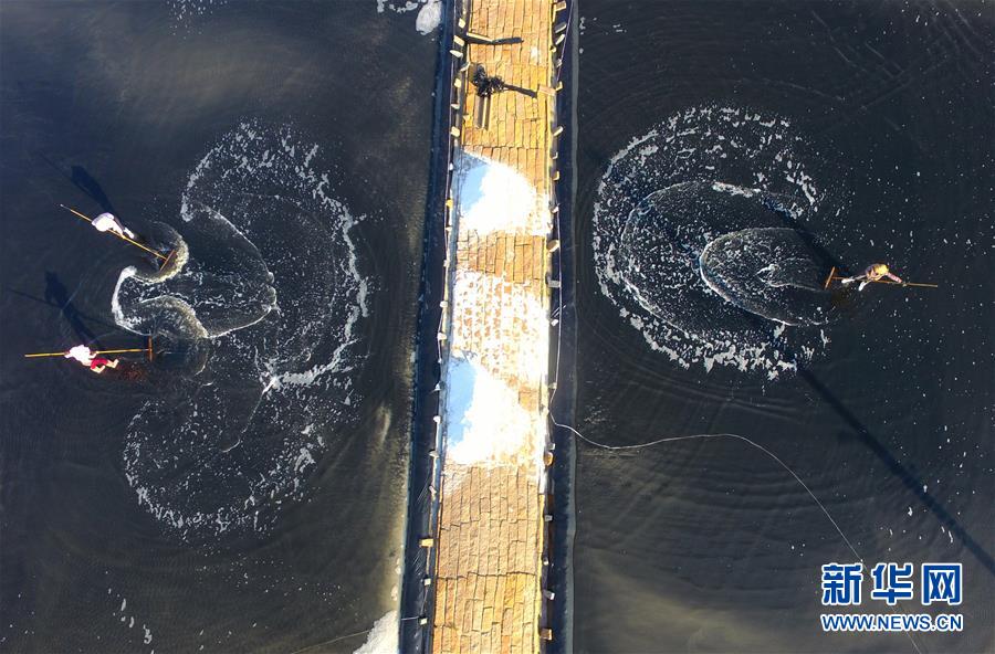 4月27日,莆田鹽場(chǎng)的工人在曬鹽池里忙碌(無(wú)人機(jī)照片)。莆田鹽場(chǎng)位于福建省莆田市秀嶼區(qū)東嶠鎮(zhèn),辛勤勞作的鹽工、縱橫交錯(cuò)的曬鹽池,共同構(gòu)成如畫的風(fēng)景。新華社記者魏培全攝