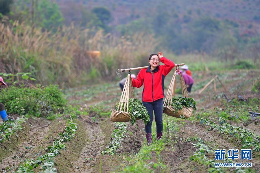 在廣西融水苗族自治縣永樂鎮(zhèn)紅薯種植基地,石秋香挑著紅薯苗,準(zhǔn)備種植(3月14日攝)。
