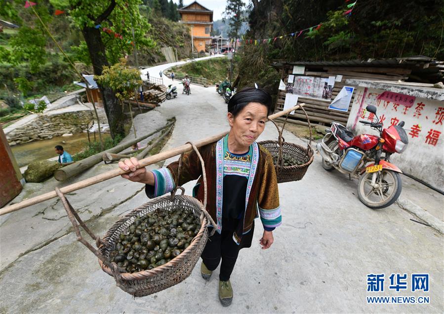 3月25日,在桂黔烏英苗寨,村民將螺苗挑往稻田,準備投放。新華社記者黃孝邦攝