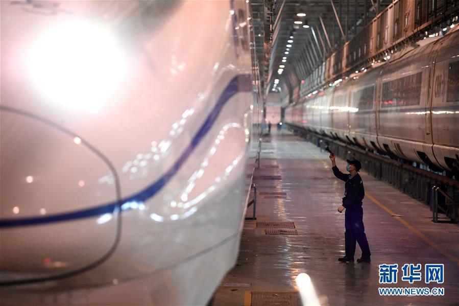 4月29日夜,合肥南動(dòng)車運(yùn)用所的工作人員對(duì)動(dòng)車組進(jìn)行檢修。每當(dāng)夜深人靜的時(shí)候,合肥南動(dòng)車運(yùn)用所卻燈火通明,“動(dòng)車安全守護(hù)者”們堅(jiān)守崗位,對(duì)動(dòng)車組進(jìn)行全面細(xì)致檢修。新華社記者 劉軍喜 攝