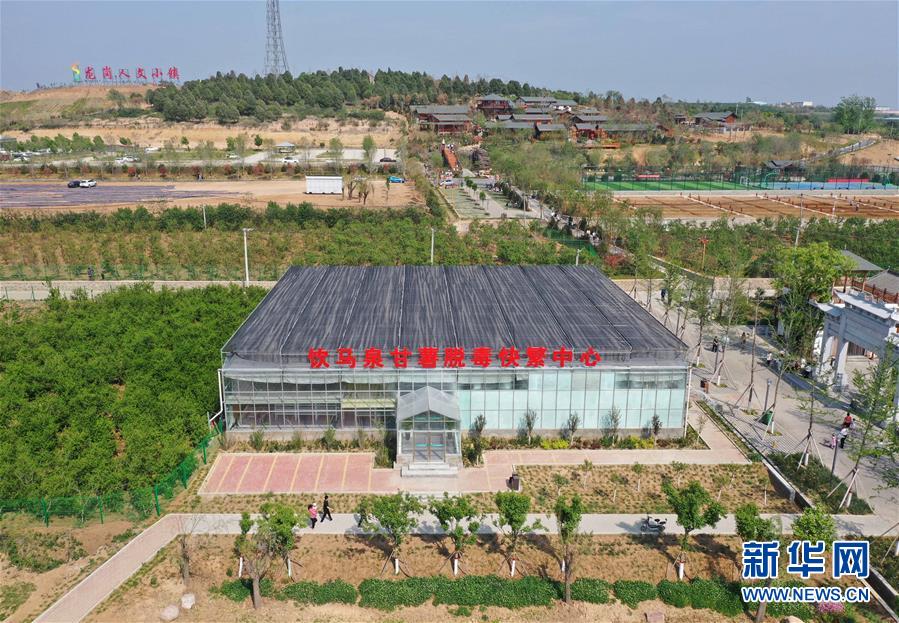 這是5月1日拍攝的河南省鶴壁市淇濱區(qū)鉅橋鎮(zhèn)崗坡村飲馬泉甘薯脫毒快繁中心(無人機(jī)照片)。 新華社記者馮大鵬攝