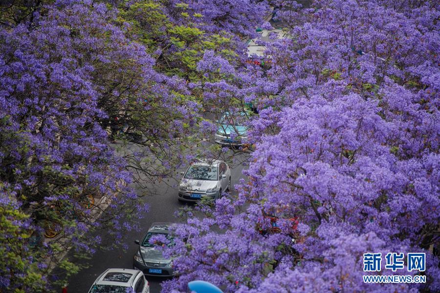 這是5月2日在昆明市桃源街拍攝的藍(lán)花楹。近日,云南省昆明市部分街區(qū)的藍(lán)花楹競相開放,為春城增添靚麗風(fēng)景。新華社記者藺以光攝