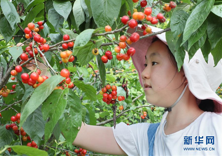 5月2日,一名小游客在江蘇無(wú)錫宜興市白塔村櫻桃園采摘櫻桃?!拔逡弧奔偃掌陂g,人們以多種方式放松心情、享受假日。新華社發(fā)(丁煥新攝)