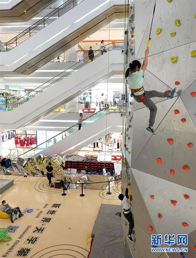 5月2日,小朋友在上海市南京路的一家百貨商場(chǎng)內(nèi)體驗(yàn)攀巖運(yùn)動(dòng)?!拔逡弧奔偃掌陂g,人們以多種方式放松心情、享受假日。新華社記者陳飛攝