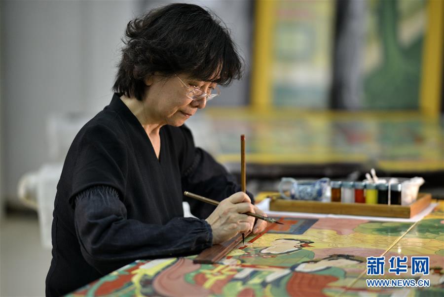 5月4日,工藝美術(shù)大師胡昕在進(jìn)行屏風(fēng)畫(huà)面最后的檢視修補(bǔ)。