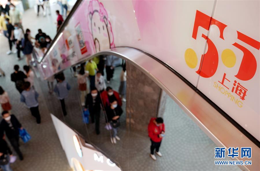 上海一家商場(chǎng)布置的“五五購(gòu)物節(jié)”標(biāo)識(shí)(5月5日攝)。5月4日晚,上海首次啟動(dòng)大規(guī)模商業(yè)促銷活動(dòng)“五五購(gòu)物節(jié)”,多家在線新經(jīng)濟(jì)企業(yè)參與,通過(guò)線上流量?jī)?yōu)勢(shì)反哺線下賣場(chǎng),實(shí)現(xiàn)電商與實(shí)體零售融合互動(dòng),激活消費(fèi)潛力、驅(qū)動(dòng)消費(fèi)復(fù)蘇。據(jù)“上海發(fā)布”的消息,截至5日14時(shí)12分,“五五購(gòu)物節(jié)”上海地區(qū)消費(fèi)支付總額已超100億元。新華社記者劉穎攝