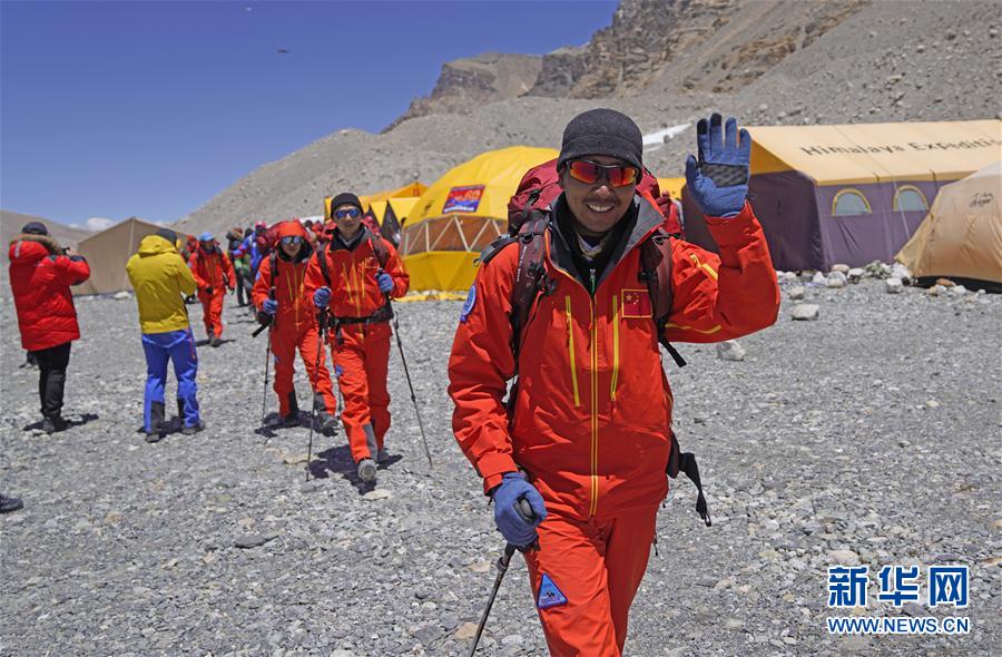 5月6日,登山隊員們在珠峰大本營舉行出發(fā)儀式。