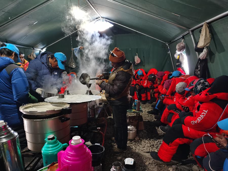 在海拔6500米的珠峰前進(jìn)營地召開的前方工作協(xié)調(diào)會(5月7日攝)。新華社特約記者邊巴攝