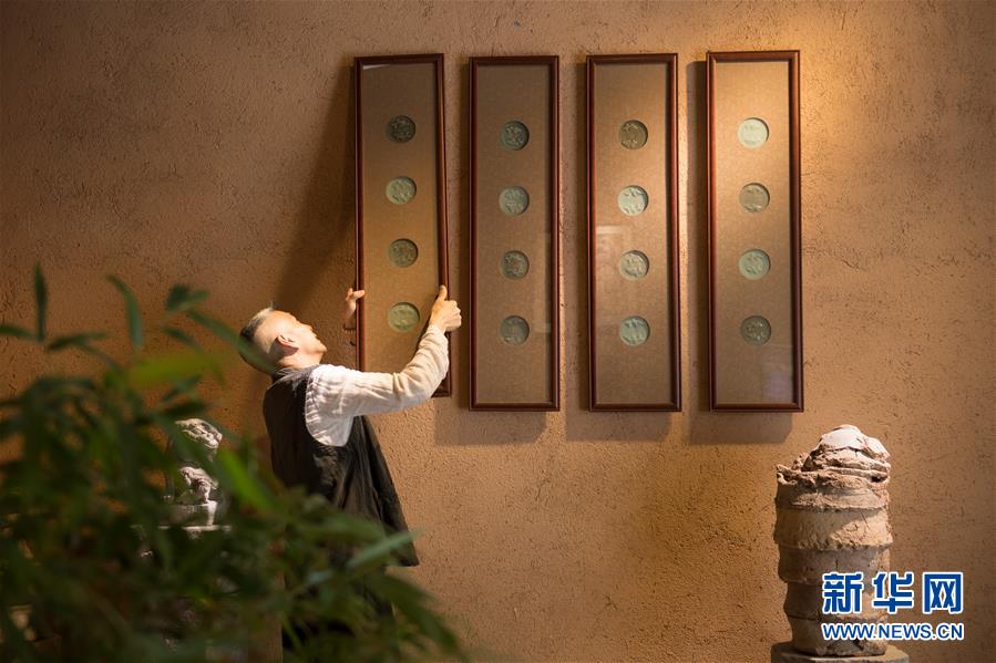 5月7日,項(xiàng)宏金在龍泉青瓷裝飾紋樣研究所懸掛用古青瓷標(biāo)本制作的掛框。1965年出生的項(xiàng)宏金,被浙江龍泉年輕一代瓷人稱為“項(xiàng)哥”,他從20世紀(jì)90年代開始收集龍泉青瓷標(biāo)本,研究青瓷紋樣。2014年出版著作《龍泉青瓷裝飾紋樣》,次年開設(shè)龍泉青瓷裝飾紋樣研究所,將自己收藏的千余件標(biāo)本跟瓷器愛好者、創(chuàng)作者免費(fèi)分享。新華社記者翁忻旸攝