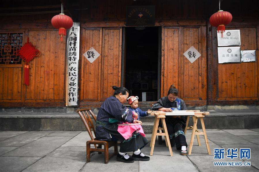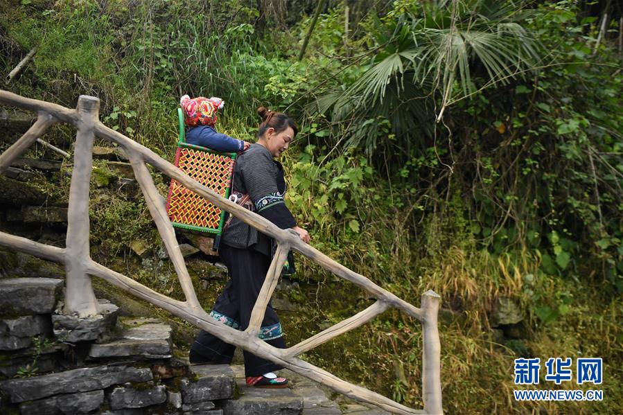 吳美金背著孫子走在十八洞村中,準(zhǔn)備前往村里的苗繡合作社(4月24日攝)。1967年出生的吳美金,1992年嫁入飛蟲村(現(xiàn)十八洞村飛蟲寨)時(shí),只有爛泥路的飛蟲村不僅田土少,掙錢活路也少,生活十分困難。2014年,吳美金加入了十八洞村苗繡特產(chǎn)農(nóng)民專業(yè)合作社,從小就會(huì)的苗繡傳統(tǒng)手藝如今成了家庭增收的法寶,不僅在家門口就把錢掙了,同時(shí)還能照顧年幼的孫子孫女。“現(xiàn)在的日子,比年輕的時(shí)候好多了。”吳美金說(shuō)。新華社記者薛宇舸攝