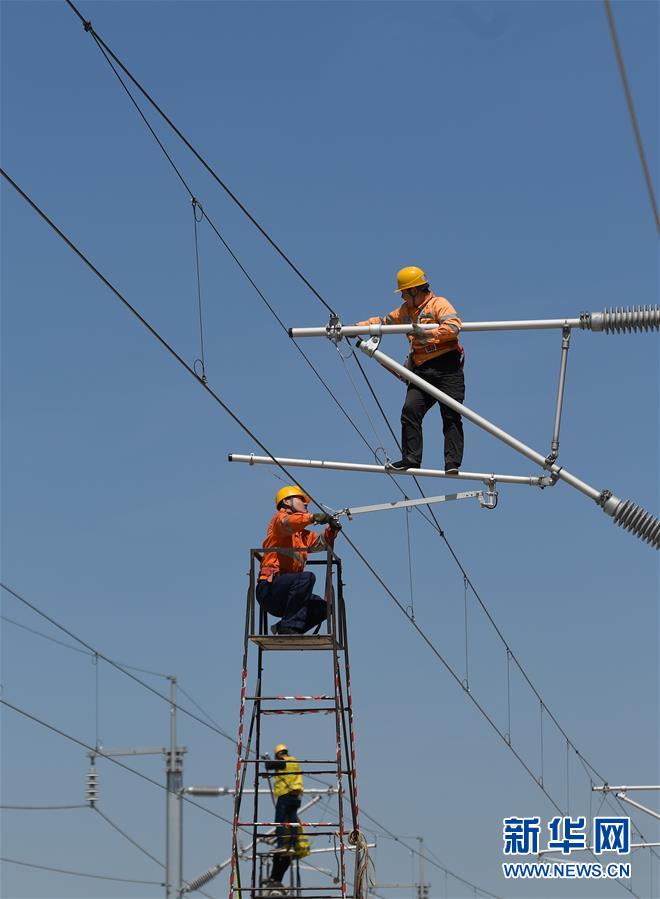 5月12日,中國鐵路上海局集團公司上海高鐵維修段的技術人員在商合杭高鐵浙江湖州段調整接觸網(wǎng)導線。近日,商合杭高鐵合肥至湖州段聯(lián)調聯(lián)試正有條不紊進行中。中國鐵路上海局集團公司上海高鐵維修段抽調49名精兵強將,持續(xù)對管轄范圍內的高鐵線路、信號、接觸網(wǎng)線進行調試,為下一階段打下基礎。據(jù)了解,商合杭高鐵合湖段聯(lián)調聯(lián)試之后將轉入運行試驗階段,驗收合格并通過安全評估后,力爭6月底具備開通運營條件。新華社記者黃宗治攝