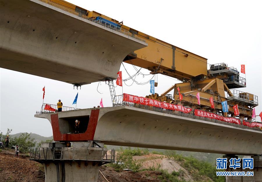 5月13日,運(yùn)架一體機(jī)在位于河南焦作的施工現(xiàn)場進(jìn)行架梁作業(yè)(無人機(jī)照片)。 當(dāng)日,隨著最后一榀長24米、重552噸的箱梁架設(shè)就位,太焦高鐵全線橋梁架設(shè)完成。從山西太原到河南焦作的太焦高鐵是國家規(guī)劃建設(shè)的“八縱八橫”高速鐵路網(wǎng)的重要組成部分,計(jì)劃2020年底建成通車。 新華社記者李安攝