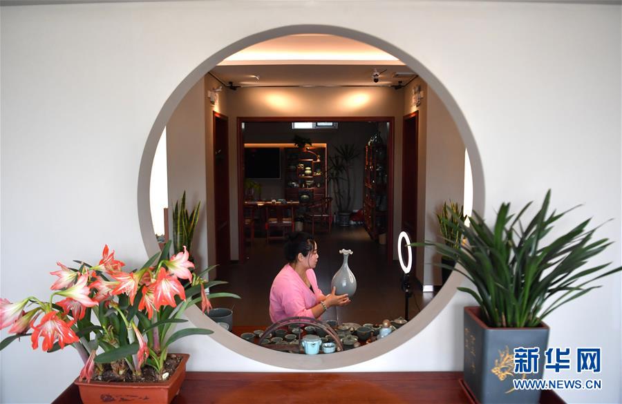 5月13日,寶豐縣大營鎮(zhèn)的汝瓷藝人宋召冰在汝瓷作坊直播介紹汝瓷產(chǎn)品。新華社記者李嘉南攝