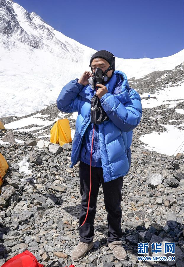 5月18日,國測一大隊沖頂隊員王偉在練習使用氧氣面罩。新華社特約記者扎西次仁攝