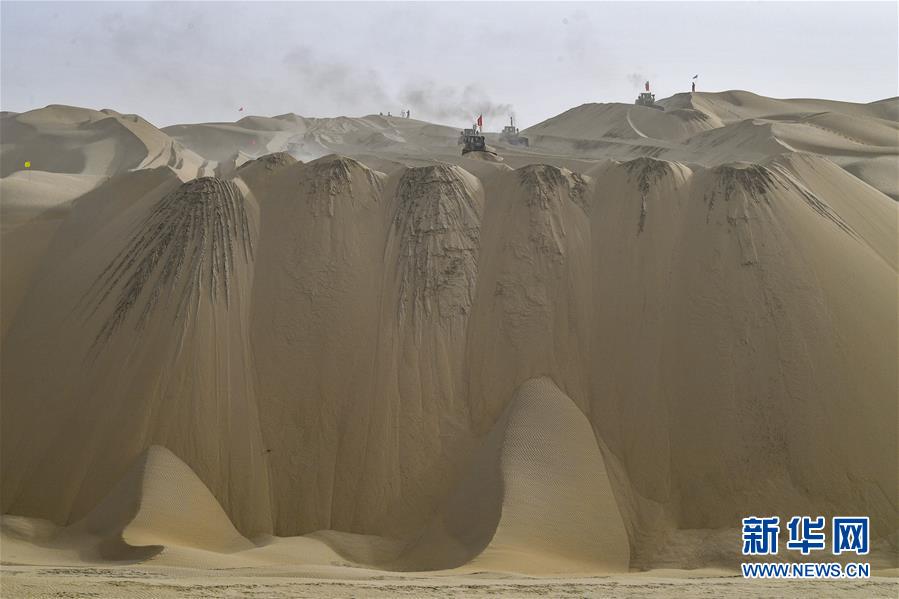 在新疆尉犁至且末沙漠公路施工現(xiàn)場,工人駕駛大型推土機推平沙山(5月17日攝)。新華社記者胡虎虎攝