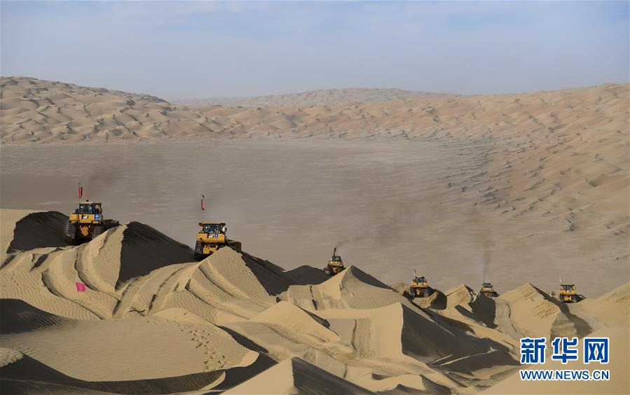 在新疆尉犁至且末沙漠公路施工現(xiàn)場,工人駕駛大型推土機推平沙山(5月16日攝)。新華社記者宋彥樺攝