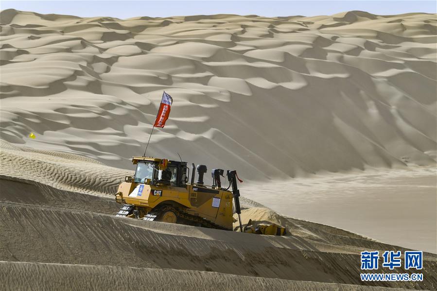 在新疆尉犁至且末沙漠公路施工現(xiàn)場,工人駕駛大型推土機(jī)推平沙山(5月16日攝)。新華社記者胡虎虎攝