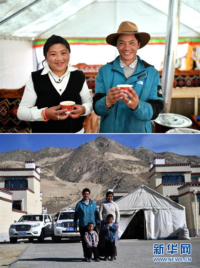 拼版照片上圖:在森布日極高海拔地區(qū)生態(tài)搬遷安置點,格多(右)和妻子洛巴在展示自家打的酥油茶;下圖:在森布日極高海拔地區(qū)生態(tài)搬遷安置點,格多(后左)和妻子洛巴及大兒子扎西尼瑪(前右)、小兒子普巴多杰在帳篷茶館前合影(照片均攝于4月15日)。格多的老家在西藏那曲市安多縣色務鄉(xiāng),一個藏北偏遠的牧區(qū)。2019年底,政府對平均海拔4500米以上的那曲市安多縣、雙湖縣進行極高海拔地區(qū)生態(tài)搬遷。和格多一家一樣,安多縣、雙湖縣搬遷下來的4000余名群眾完成了人生的遷徙,開啟了更加美好的生活。黨的十八大以來,我們堅持以人民為中心的發(fā)展思想,明確了到2020年我國現(xiàn)行標準下農村貧困人口實現(xiàn)脫貧、貧困縣全部摘帽、解決區(qū)域性整體貧困的目標任務。目前看,脫貧進度符合預期,成就舉世矚目。這些成績的取得,凝聚了全黨全國各族人民智慧和心血,是廣大干部群眾扎扎實實干出來的。脫貧摘帽不是終點,而是新生活、新奮斗的起點。新華社記者詹彥攝