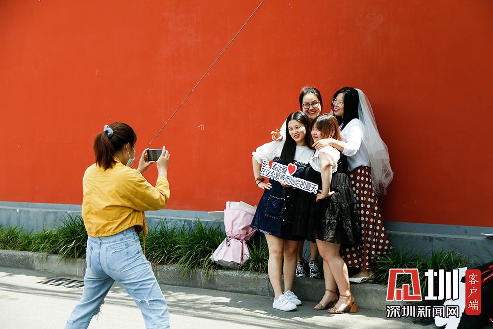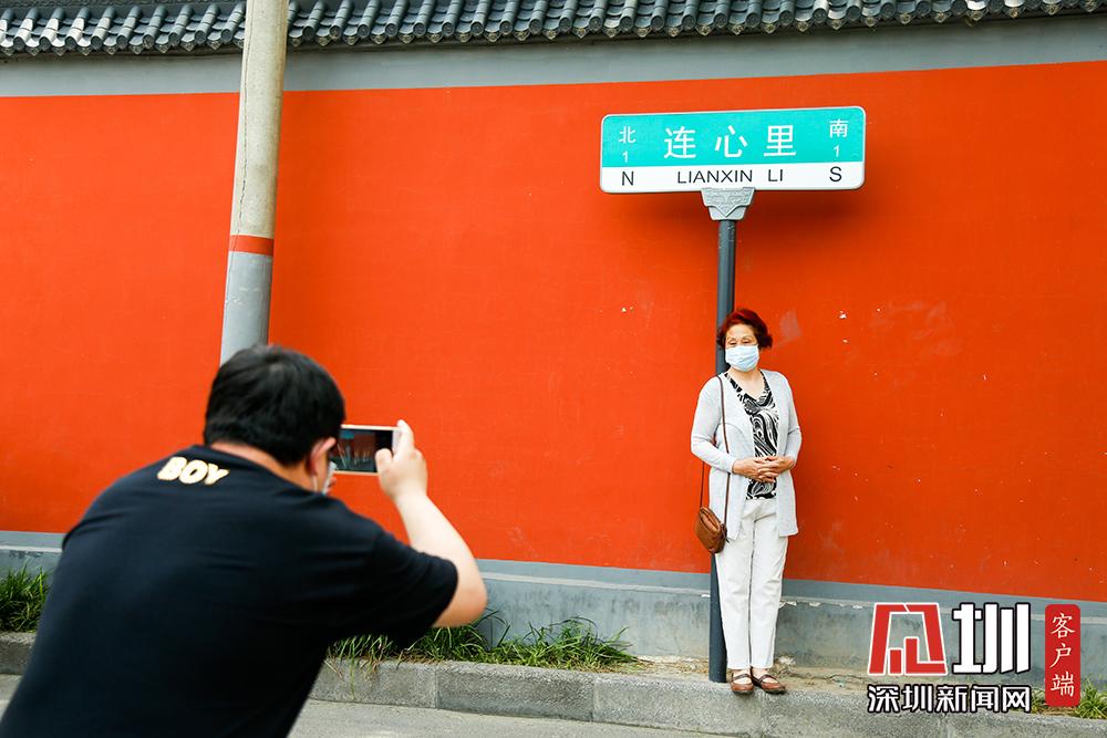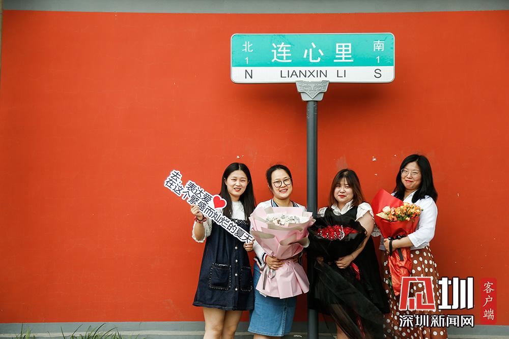 不過,在5月20日當(dāng)天來這里拍照的情侶或夫妻并不多,反倒有眾多“單身狗”與同性閨蜜一起,在“連心里”的路牌下、紅墻邊,手捧鮮花拍照打卡。