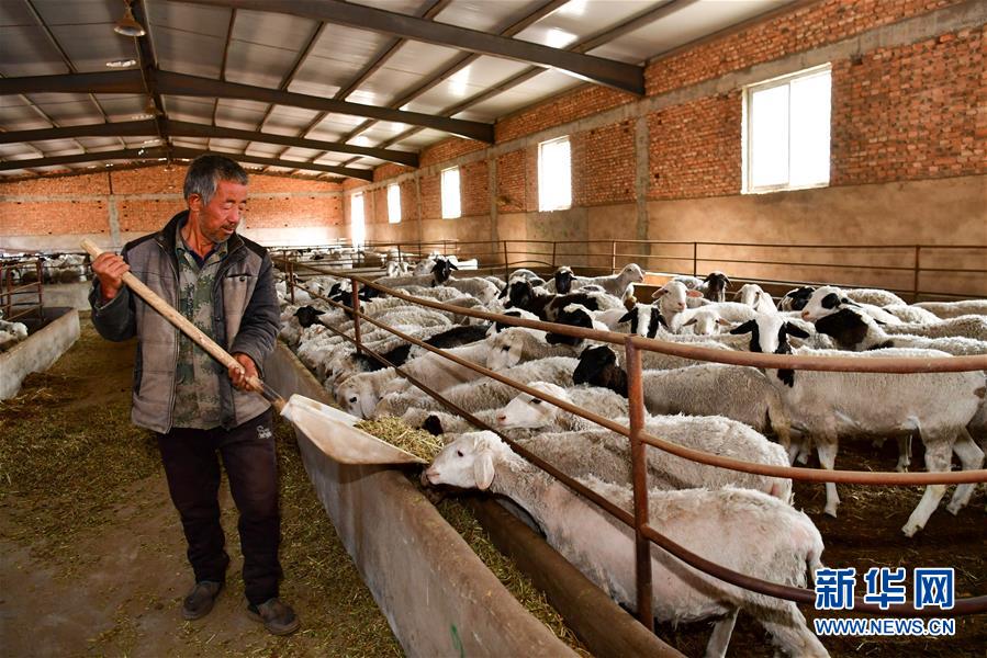 宋家溝村村民賀毛小在養(yǎng)殖合作社內(nèi)喂羊(5月19日攝)。新華社記者曹陽攝