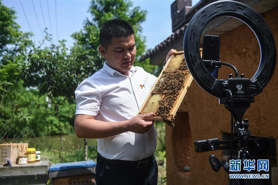 5月20日,長興縣林城鎮(zhèn)畎橋村的意蜂蜂業(yè)幫扶基地內,養(yǎng)蜂能手邱凱在進行網上直播,介紹當?shù)孛鄯漯B(yǎng)殖特色及相關蜂產品。新華社記者徐昱攝