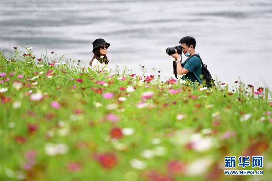 5月20日,在重慶市巴南區(qū)木洞鎮(zhèn)長江岸邊,游客在格?;êV信恼樟裟?。近日,重慶市巴南區(qū)木洞鎮(zhèn)長江岸邊的格?;ǜ傁嚅_放,吸引游客前來賞花觀景。新華社記者唐奕攝