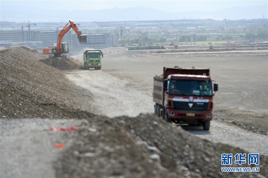 5月23日,在烏魯木齊機(jī)場改擴(kuò)建工程施工現(xiàn)場,施工車輛在飛行區(qū)進(jìn)行土方回填作業(yè)。新華社記者丁磊攝