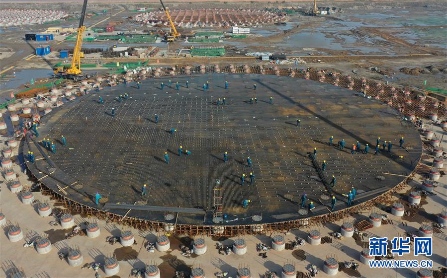 5月23日,工人在唐山市曹妃甸區(qū)LNG項目第一階段工程儲罐建設(shè)工地施工(無人機照片)。新華社記者楊世堯攝