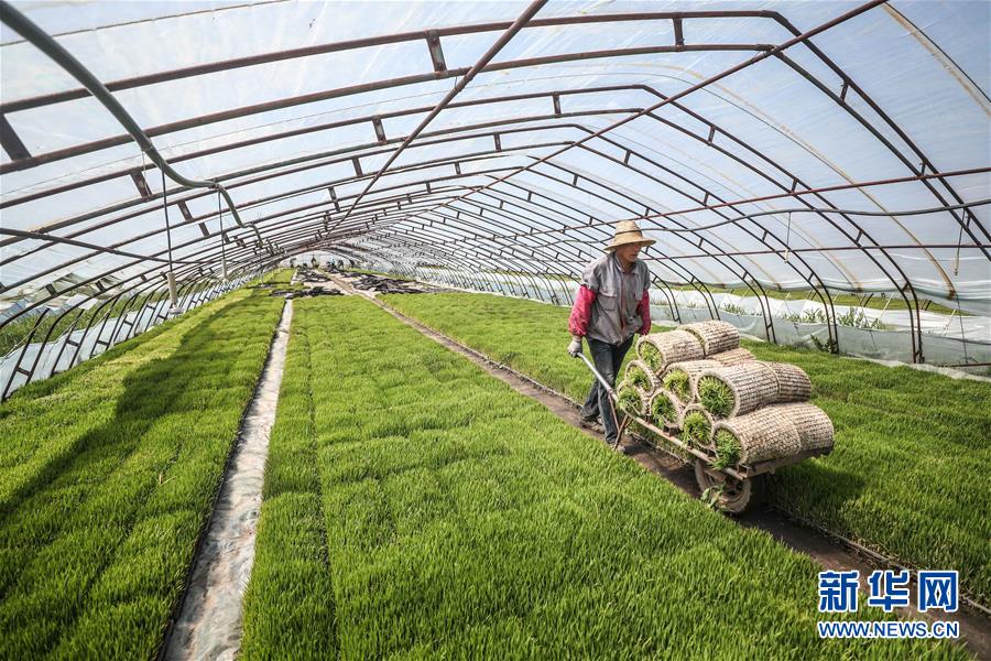 5月24日,盤錦市大洼區(qū)的農(nóng)民在育苗棚內(nèi)搬運(yùn)符合插秧標(biāo)準(zhǔn)的水稻秧苗。新華社記者潘昱龍攝