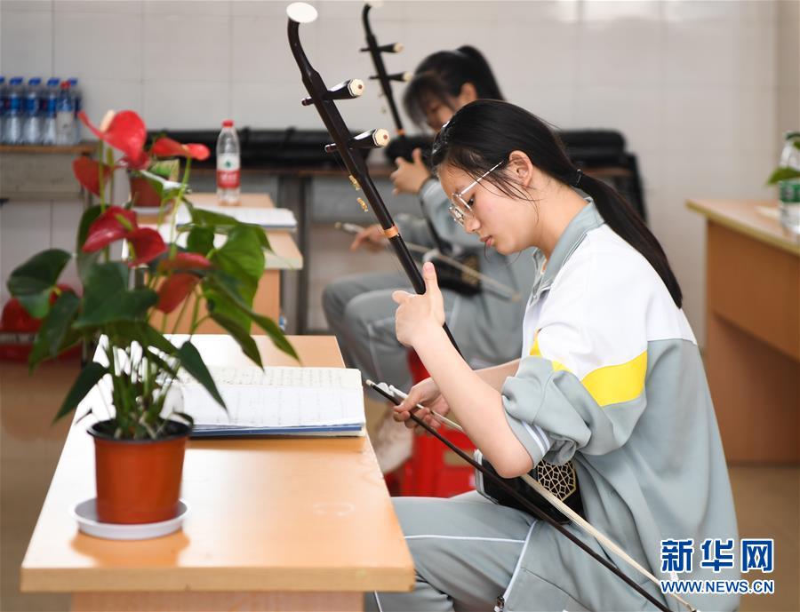 位于湖南省湘西土家族苗族自治州的瀘溪縣第五中學的學生在練習二胡(5月22日攝)。