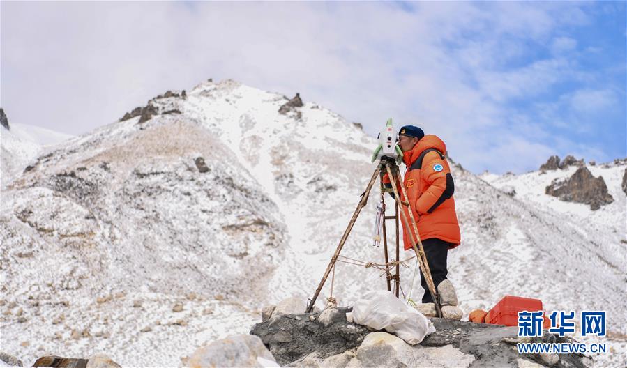 自然資源部第一大地測量隊隊員鄭林在使用全站儀對珠峰峰頂進行交會觀測(5月27日攝)。新華社記者普布扎西攝