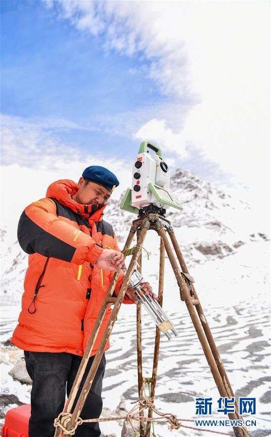 自然資源部第一大地測量隊隊員鄭林在使用全站儀對珠峰峰頂進行交會觀測(5月27日攝)。新華社記者孫非攝