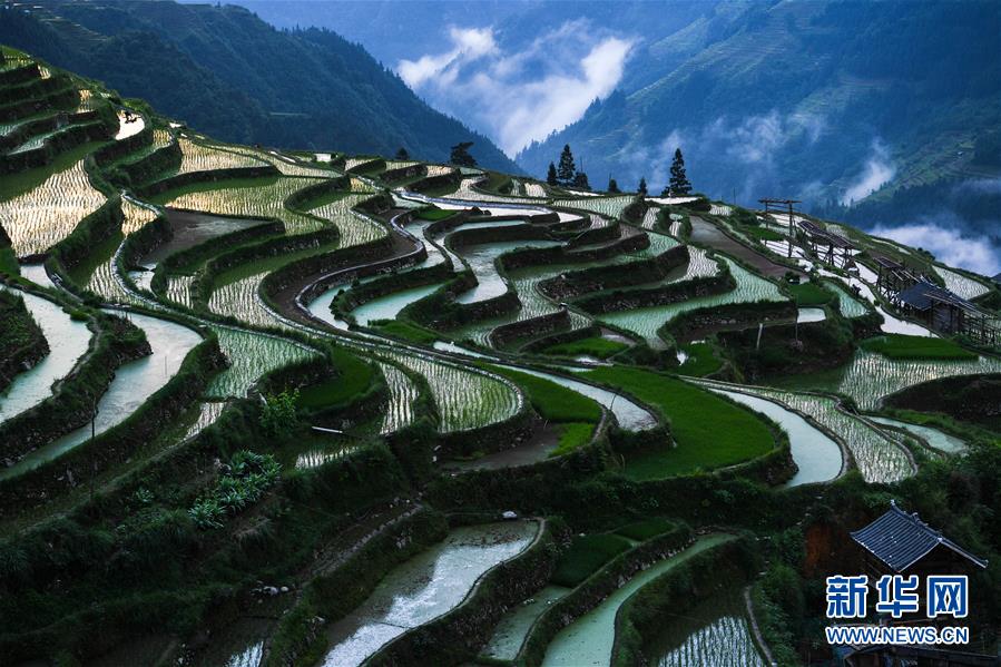 晨光中的從江縣加榜鄉(xiāng)加車梯田(5月28日攝)。夏日時節(jié),位于貴州省黔東南苗族侗族自治州從江縣加榜鄉(xiāng)加車、加頁、黨扭等苗寨的梯田在晨霧與陽光的映襯下線條分明,光影變幻,景色如畫。新華社記者 楊文斌 攝