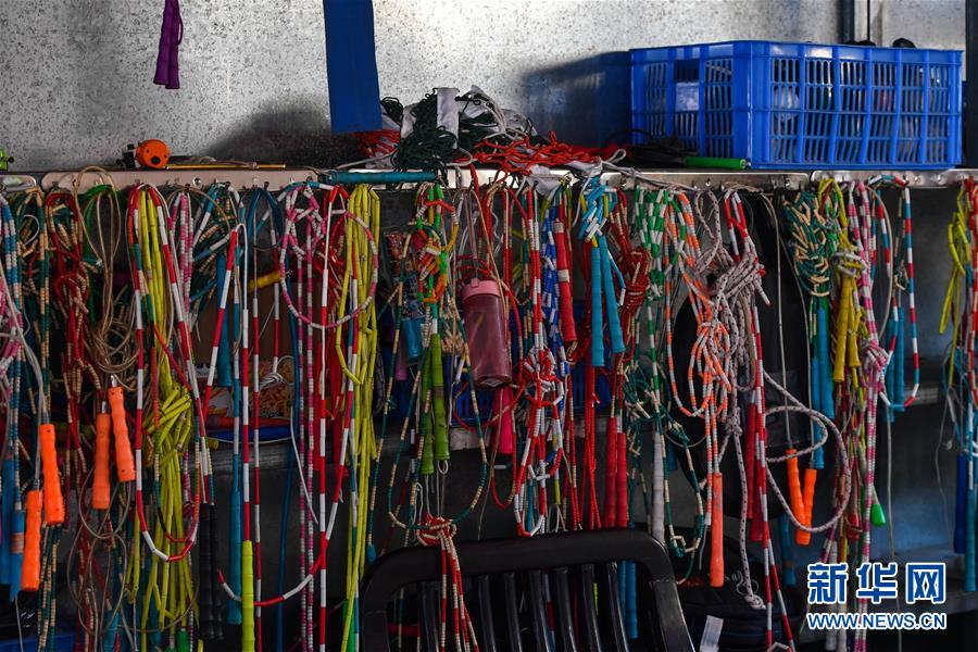 跳繩運動已經(jīng)深深融入七星小學的日常,器材室里擺放的跳繩(2019年11月18日攝)。新華社記者劉大偉攝
