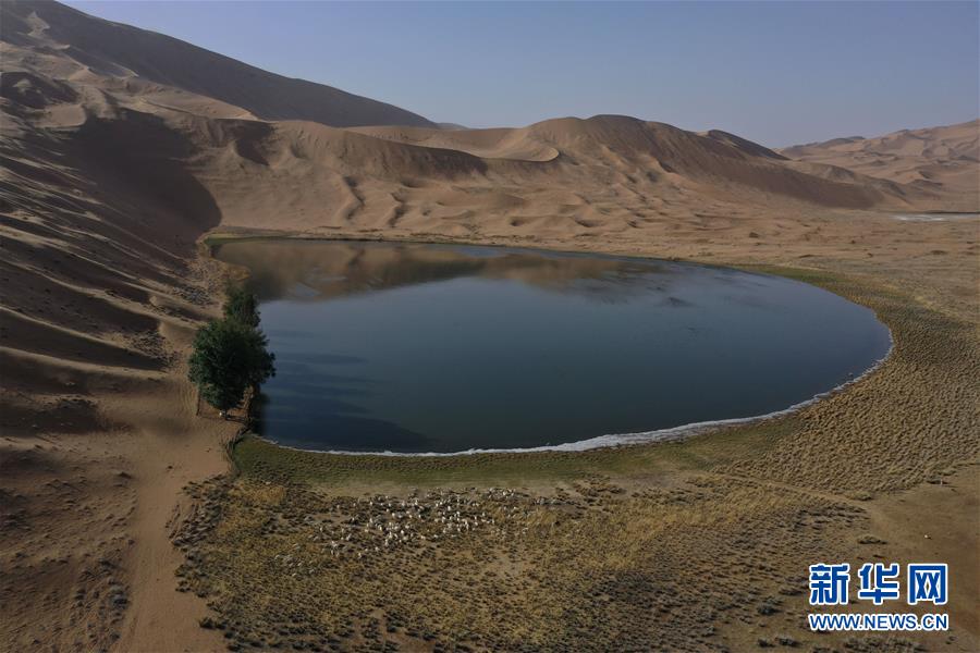 5月30日,羊群在巴丹吉林沙漠一處沙漠湖泊的湖畔休憩(無(wú)人機(jī)照片)。新華社記者徐欽攝。