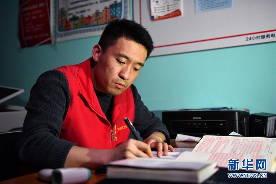 楊龍明在小區(qū)內(nèi)的值班室整理下沉日記(6月1日攝)。新華社記者李然攝。