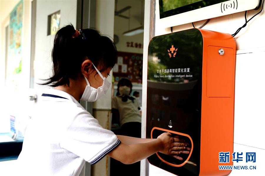 6月2日,上海閔行區(qū)鑫都小學(xué),一名小學(xué)生使用手部消毒智能霧化裝置。當(dāng)日,上海小學(xué)一、二、三年級(jí)學(xué)生返校開學(xué)。新華社記者張建松攝。