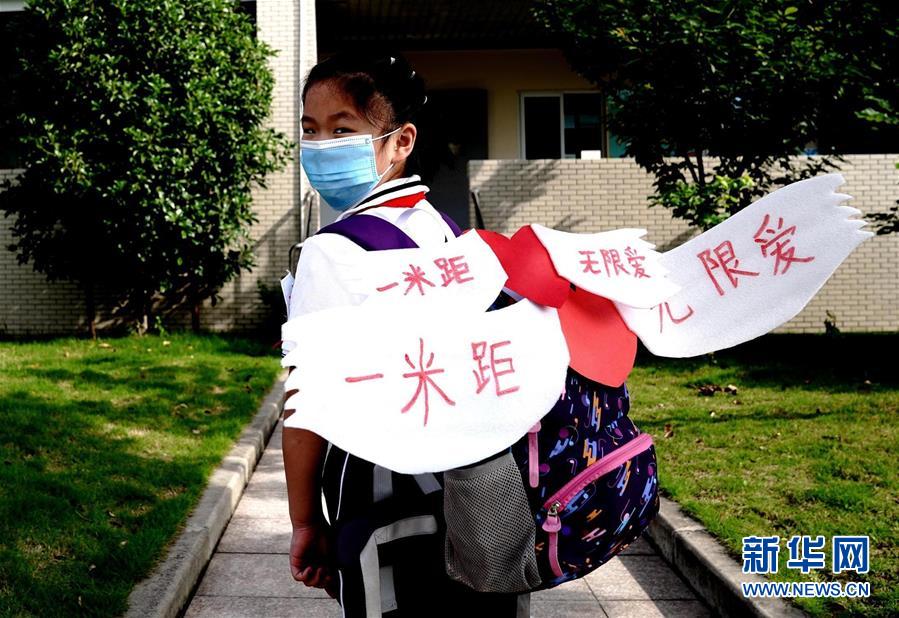 6月2日,上海閔行區(qū)鑫都小學(xué),一名小學(xué)生戴著“一米翅膀”走在校園里。當(dāng)日,上海小學(xué)一、二、三年級(jí)學(xué)生返校開學(xué)。新華社記者張建松攝